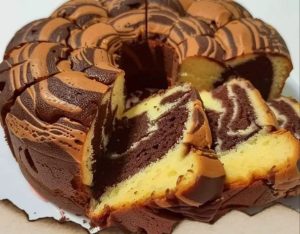 Bolu marmer punya ciri khas tekstur lembut dengan pola cokelat yang seperti marmer.