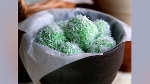 Kue kukus berwarna hijau dengan isian gula merah.